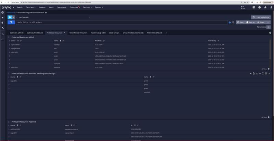 With this release, IMF messages now include detailed information such as the list of gateways and their enforcement modes, protected and unprotected resources configured on the system, resource locations and names, group configurations, trust levels, and connection activity. In Graylog, this means you can see exactly which gateways are enforcing policy, which users connected most recently, which did not, and how resources are being segmented and protected—all time-stamped and searchable.